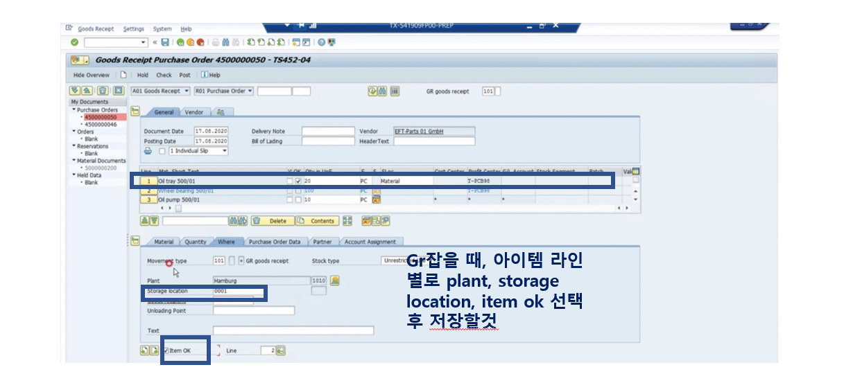 Vendor A의 경우, material a,b 각각 PR상 source of supply가 지정되어 있어서 PO가 자동생성되나