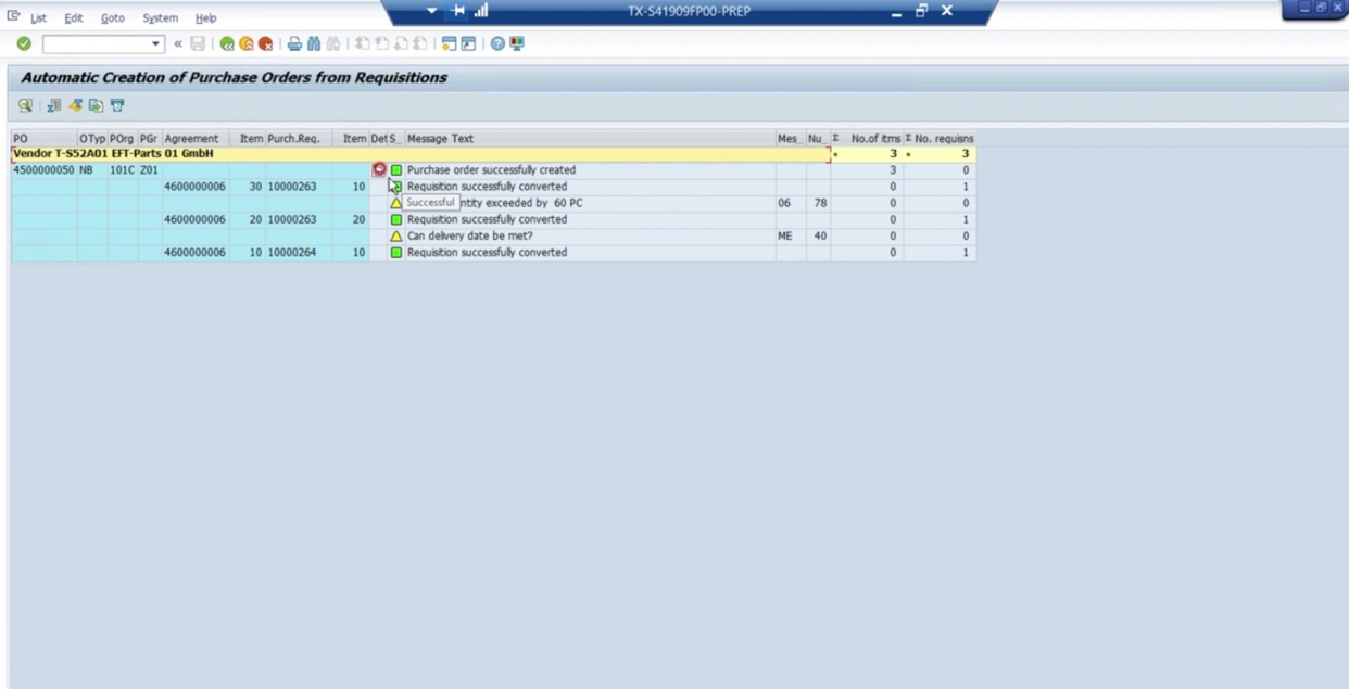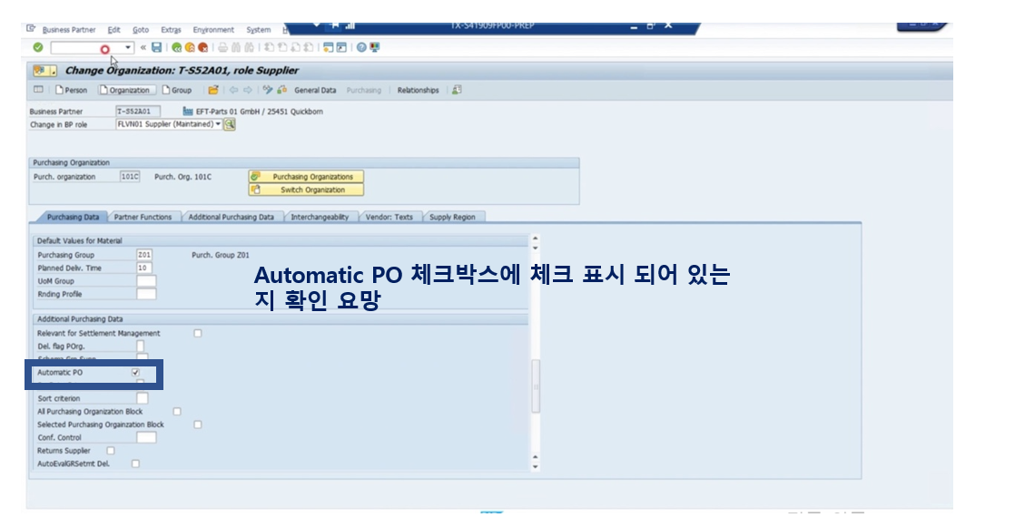 - supplier master상 해당 supplier에 'automatic purchase order' 체크 박스에 체크 되어 있어야 함
