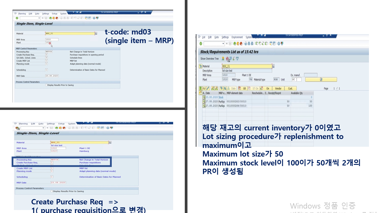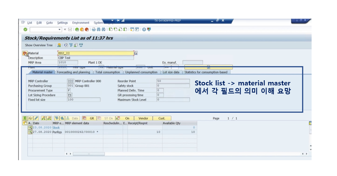 - mrp 리스트는 mrp를 돌리는 시점이고 돌린 이후에 변화된 정보는 반영하지 않는다(예를들어 stock/requitement list 보면서 pr돌렸는데 mrp 리스트에는 해당 내용이 반영되지 않음)