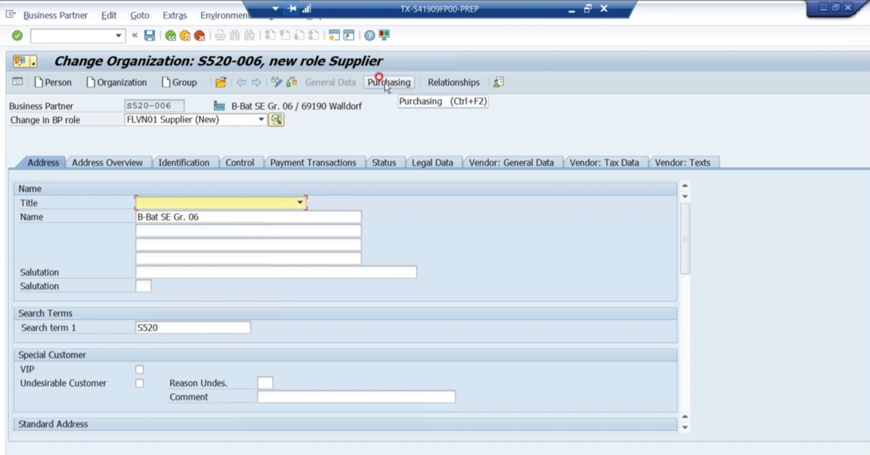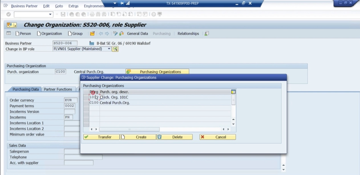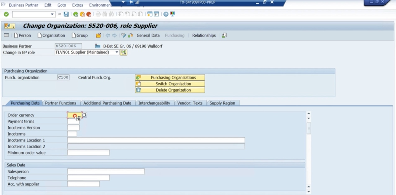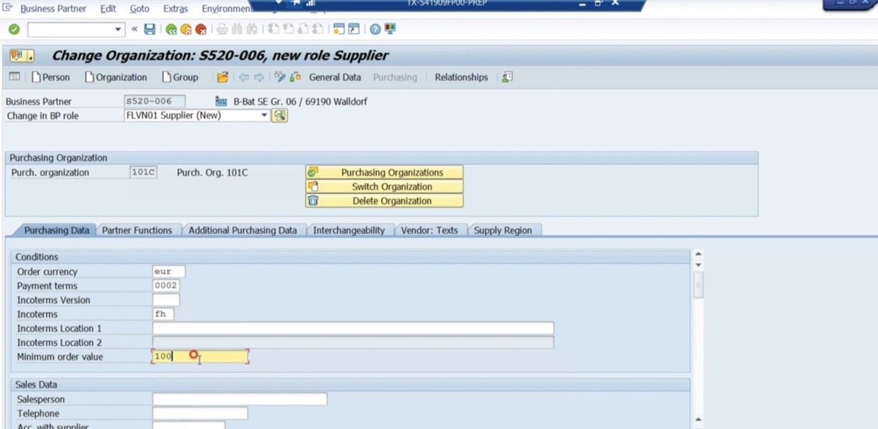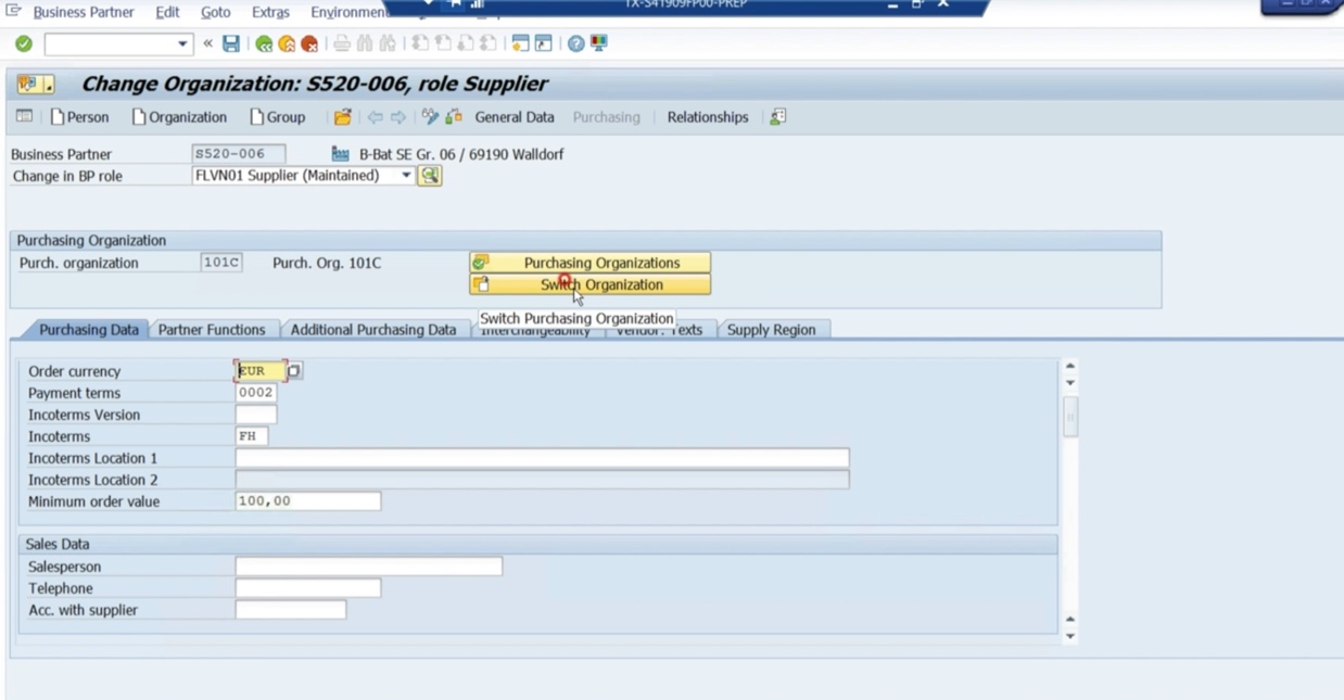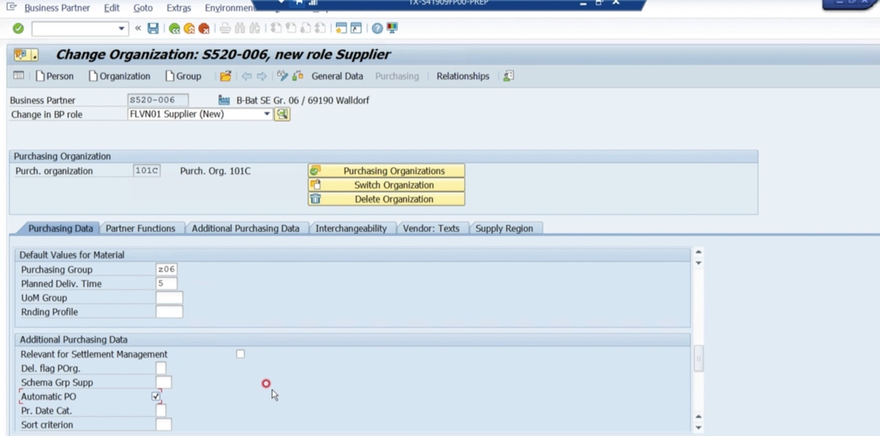 - Purchasing data : purchasing data를 생성하려면, bp role이라는 것을 선택해야함(bp role = BP의 역할이 무엇인지 정의하는 것) bp role이 supplier라면 purchasing data를 maintain할 수 있음. purchasing data는 구매조직에 따라 데이터 관리가 상이함