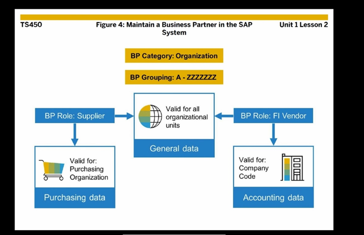 - Accounting data: accounting data를 생성하려면 bp role이 재무벤더의 역할을 해야하며 조직레벨은 company code임(company별로 데이터를 다르게 관리 할 수 있음)