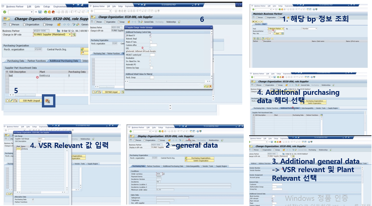 2. Supplier mater record에 VSR(vendor subrange - specific한 거는 아니고 2차 협력사에 따라 데이터 관리가 필요할때 VSR을 사용함) 혹은 (그리고) Plant relevant 추가 하기