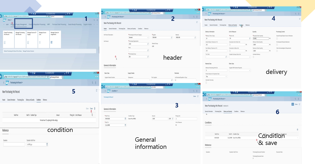 - 다른 purchasing document - 예를 들어 quotation, outline agreement, purchase order 문서에서도 info record를 생성할 수 있음( 영향을 준다는 의미)