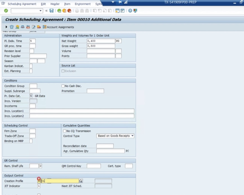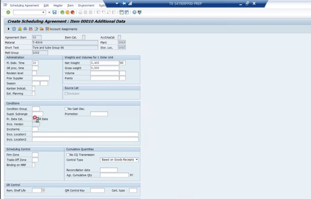 - plant specific => contract에서는 plant specific안하는 경우(centrally contract)도 있으나 scheduling agreement는 po의 속성을 가지고 있기 때문에 plant를 명시해야함