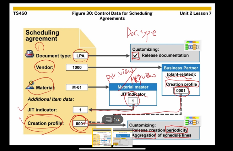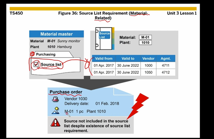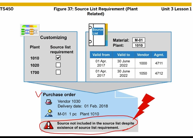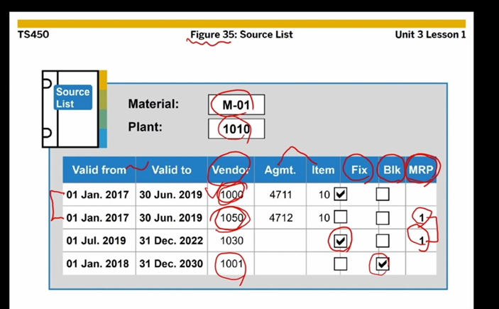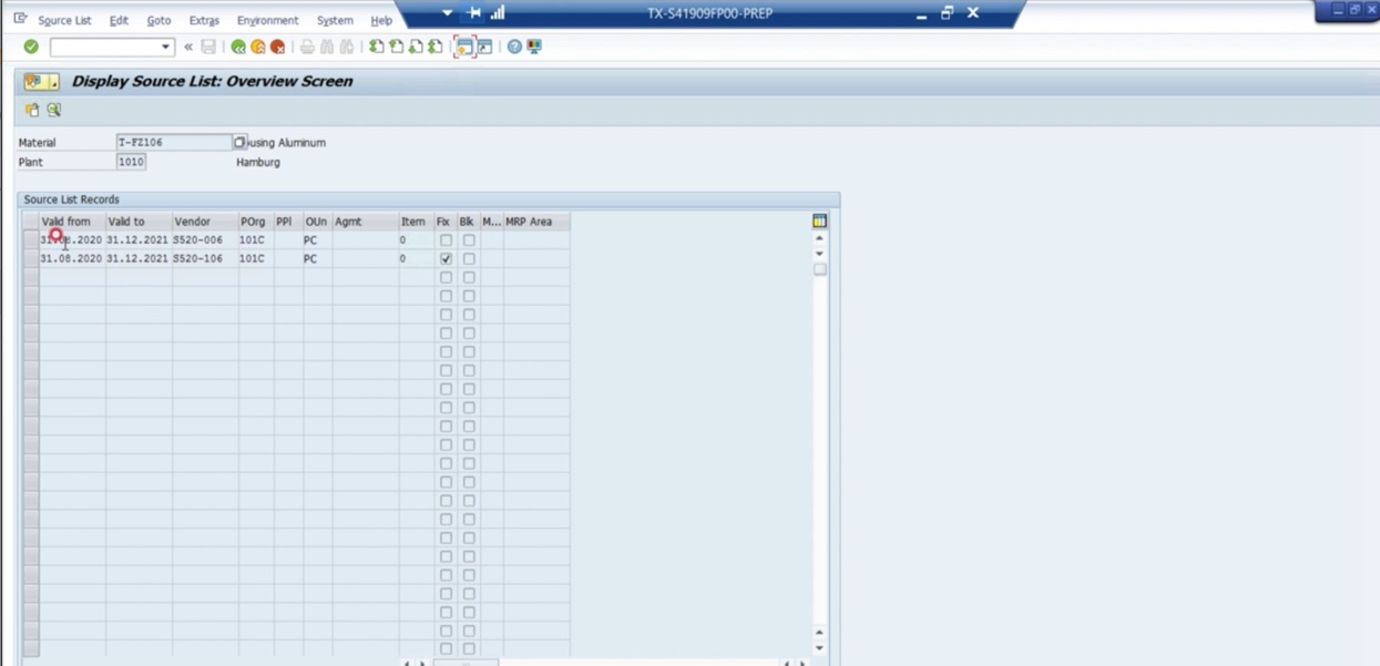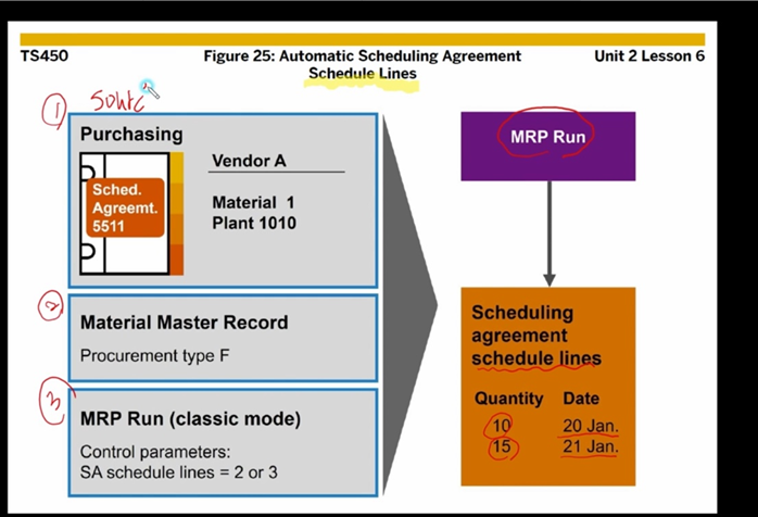 - source list - 예를 들어 vendor 1에 plant 1010에 sched agreement 및 mrp relevant가 선택 되어 있어야함