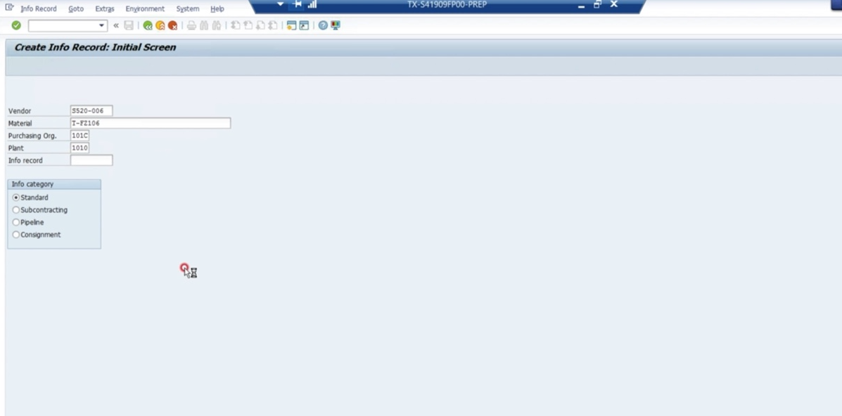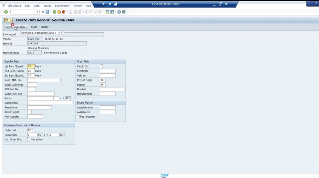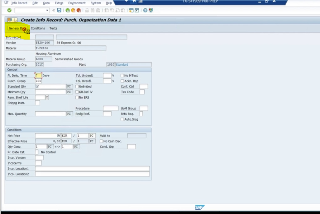 - info record 상 purchasing group, planned delivery time은 해당 material master에서 해당 자재의 purchasing view에서 가지고 온것