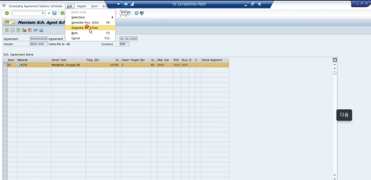 - 3) delivery schedule을 assign한 scheduling agreement를 벤더사에 전송하기