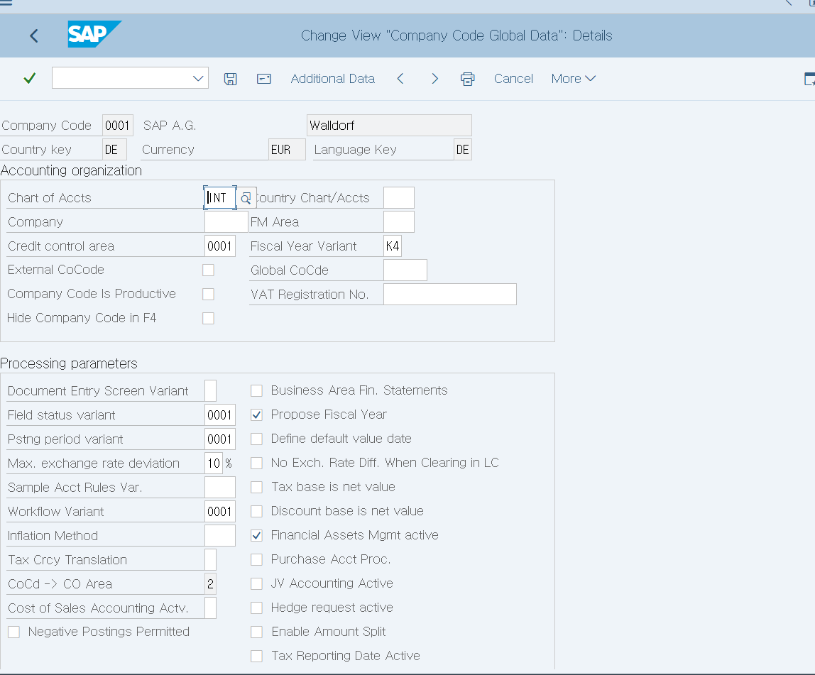 - 현재 존재하는 company code를 레퍼런스 카피하여 생성(원하면 G/L Account도 복사 가능) -> 최초에는 sap에서 기본적으로 제공되는 0001이라는 company code를 이용하여 카피할 수 있다.(0001 company code는 country specfic 하지 않고 INT라는 계정과목표를 기준으로 하는 디폴트 company code, 특정 나라에 대한 특화가 되어 있지 않은 상태인 0001에 country KR이라는 우리나라 실정에 맞는 패치를 적용함으로써 localization이 가능하다. 이부분은 최초 서버 set up시에 BC가 작업한다.)