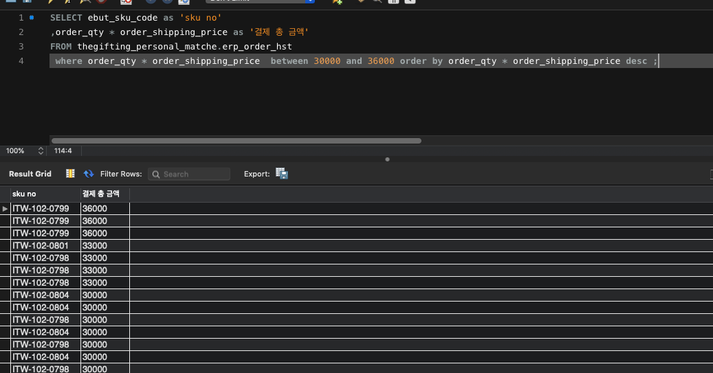 where order_qty * order_shipping_price between 30000 and 36000 order by order_qty * order_shipping_price desc ;