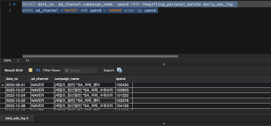 WHERE ad_channel ="NAVER" AND spend > 100000 order by spend;