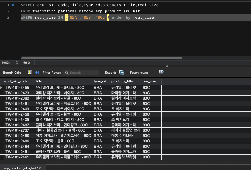 WHERE real_size IN ('85A','85B','80C') order by real_size;