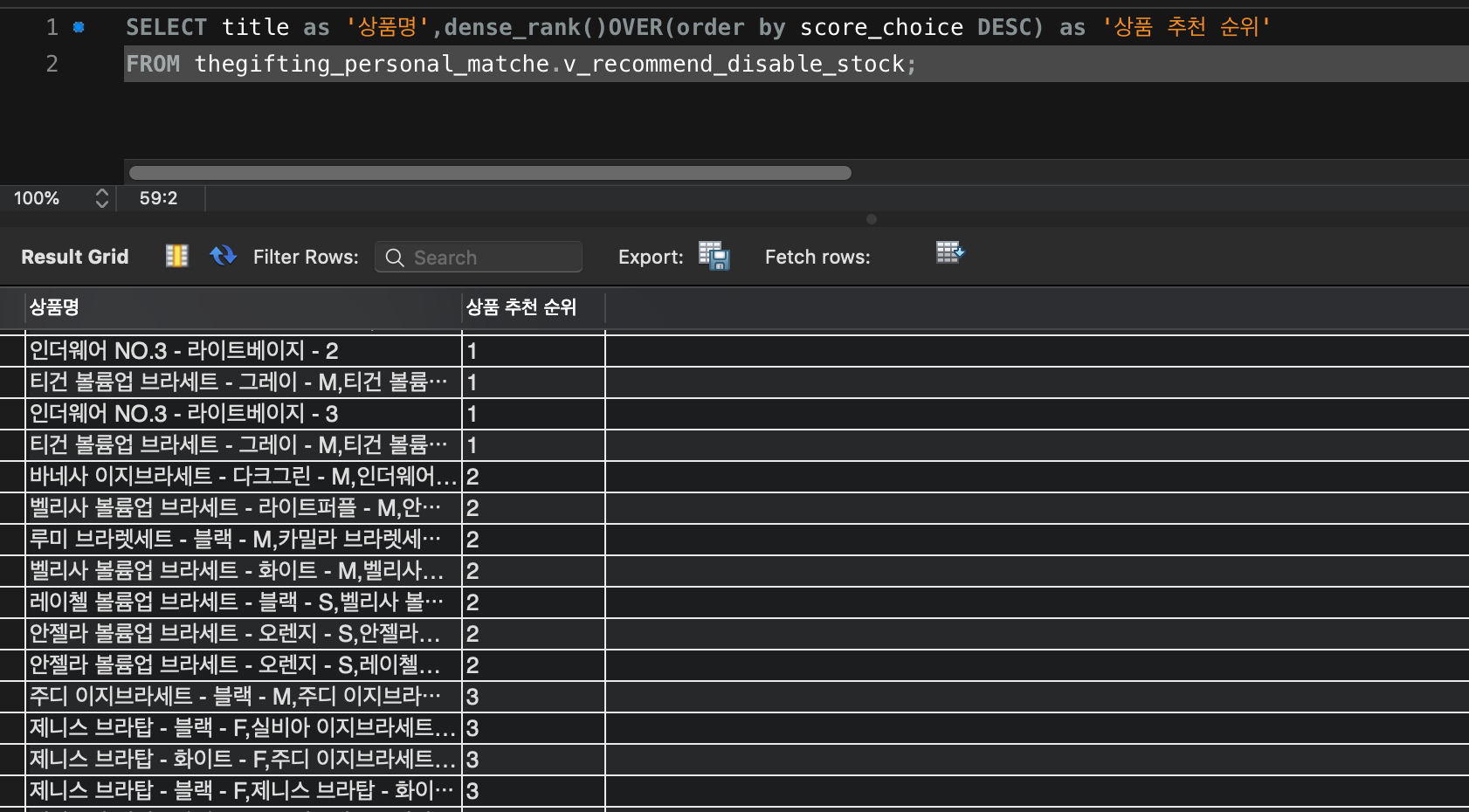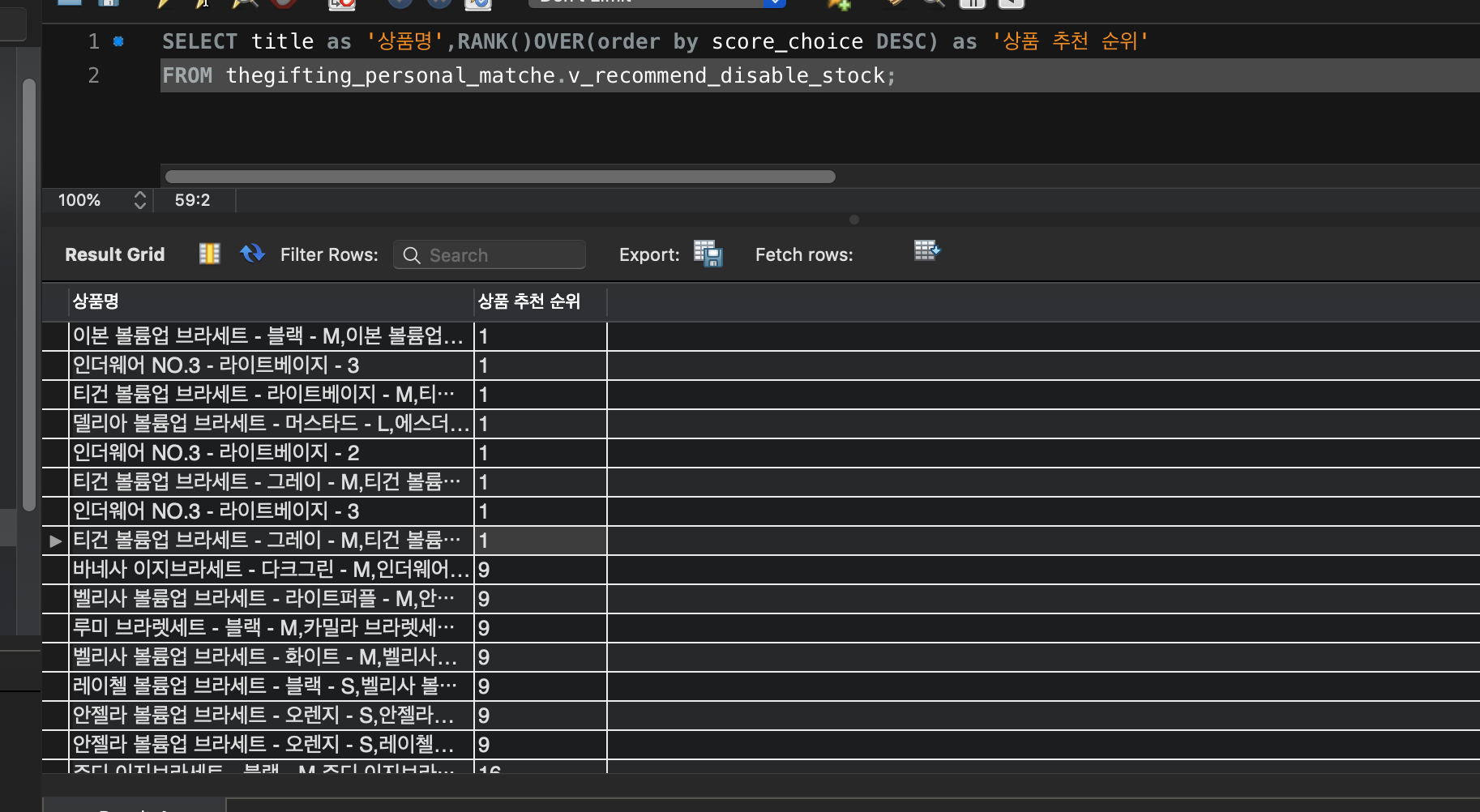 SELECT title as '상품명',dense_rank()OVER(order by score_choice DESC) as '상품 추천 순위'