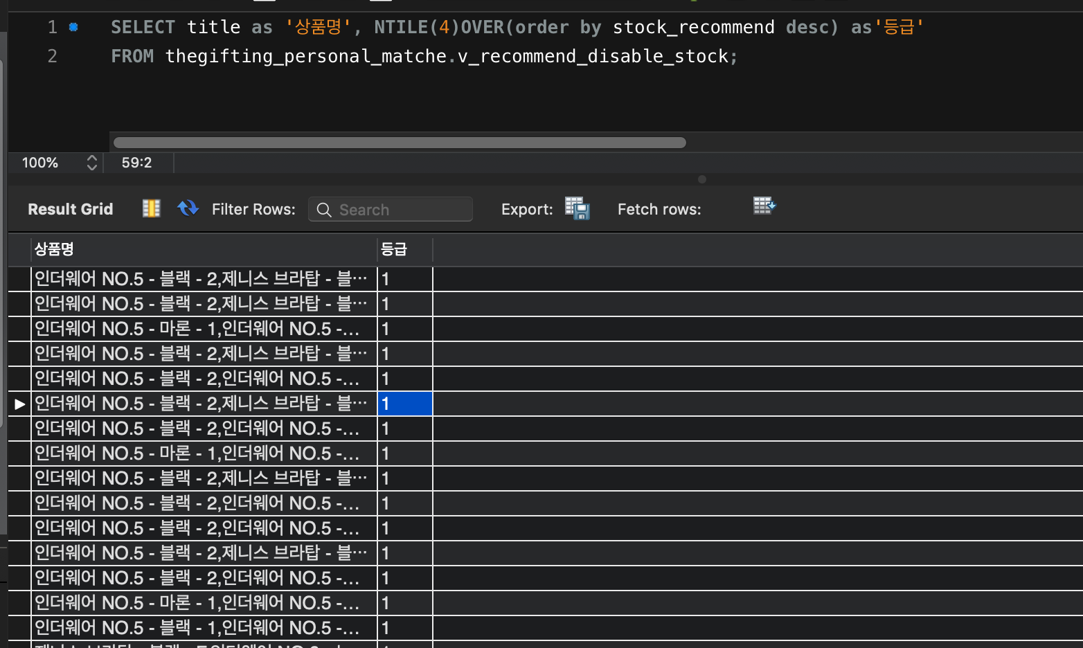 SELECT title as '상품명', NTILE(4)OVER(order by stock_recommend desc) as'등급'