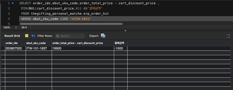 MIN(NVL(cart_discount_price,0)) AS'결제금액'