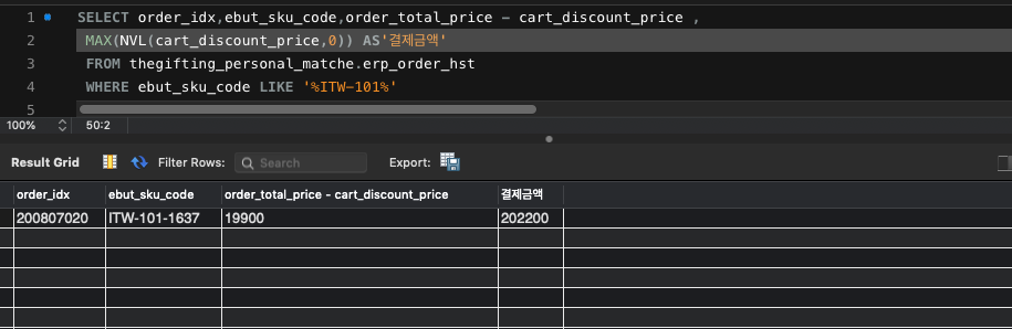 MAX(NVL(cart_discount_price,0)) AS'결제금액'