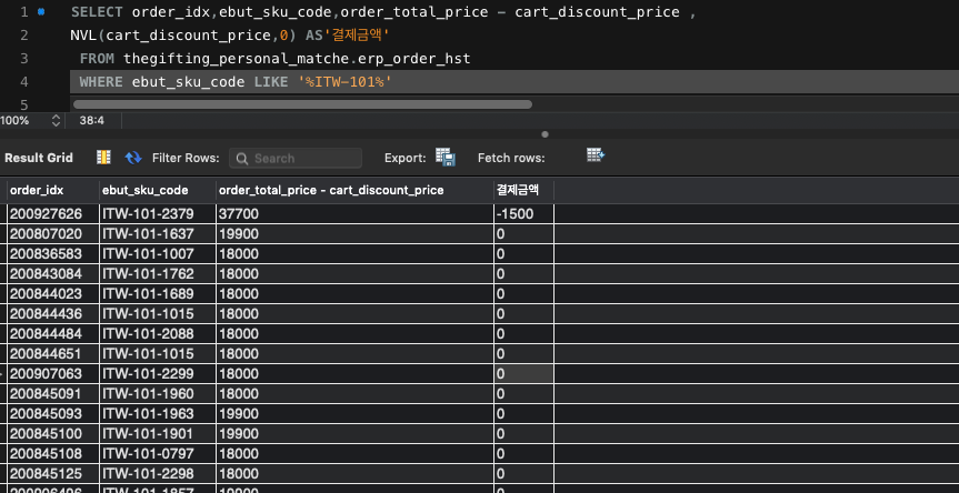 NVL(cart_discount_price,0) AS'결제금액'