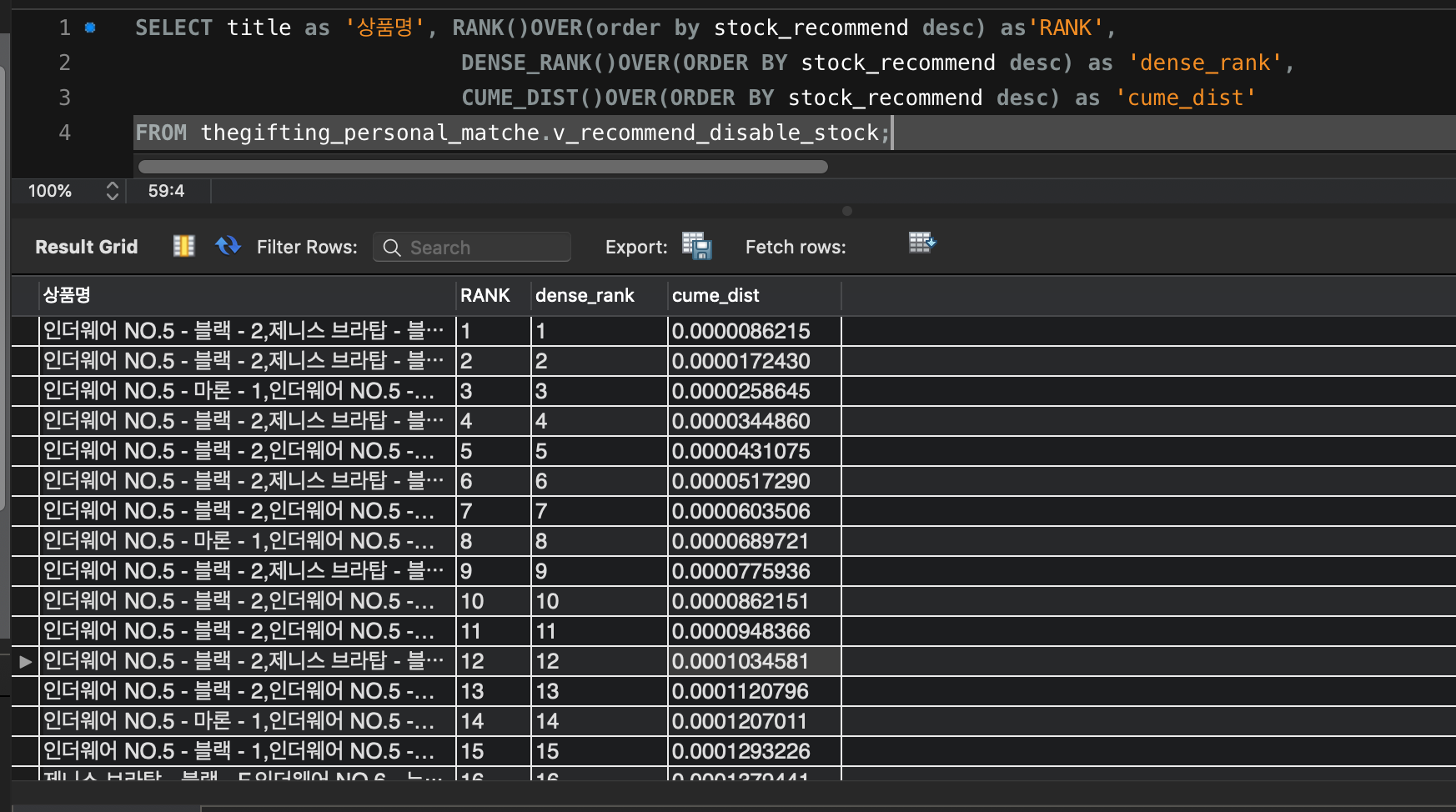 CUME_DIST()OVER(ORDER BY stock_recommend desc) as 'cume_dist'