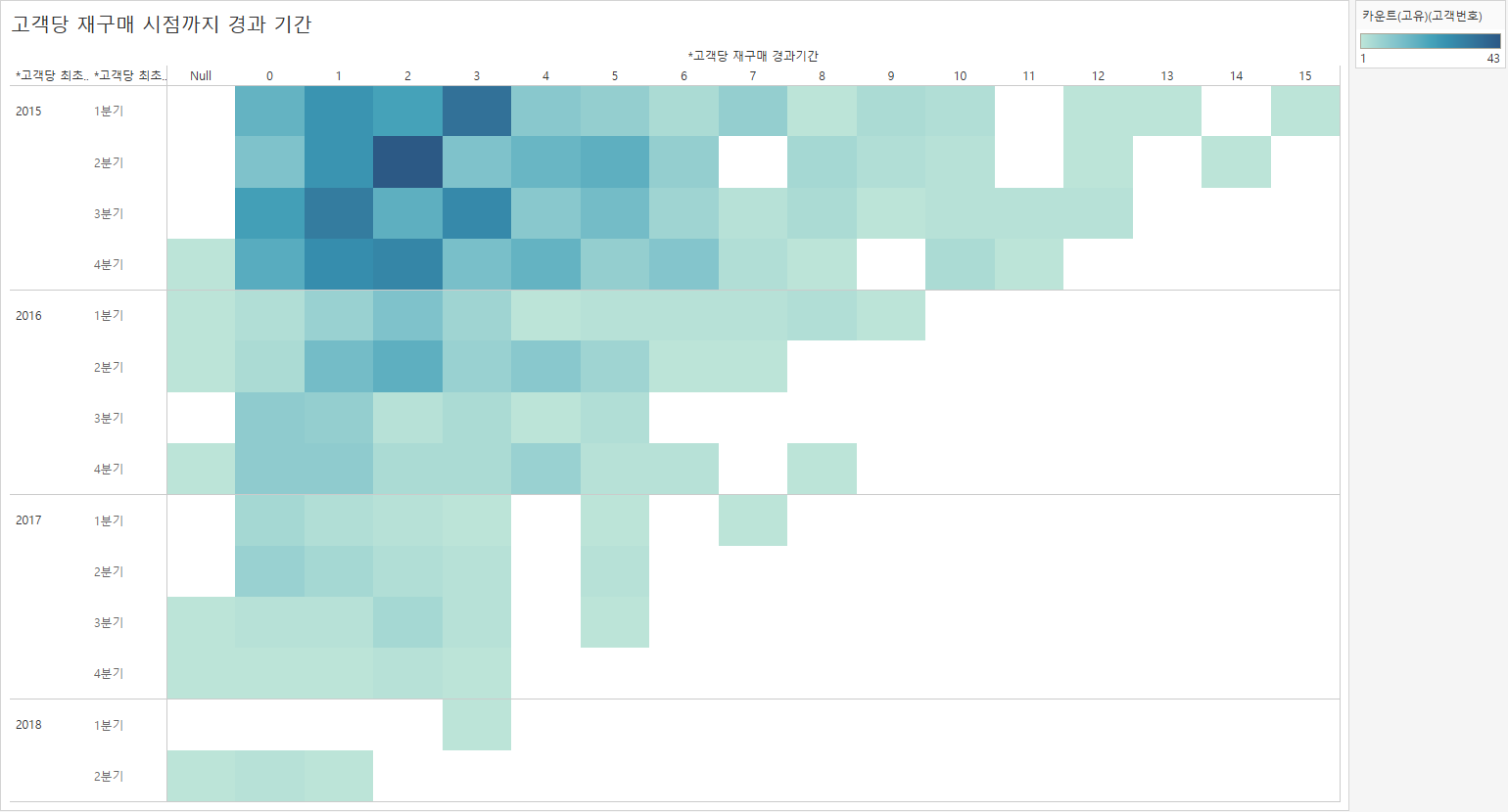 즉, 2015년 2분기에 처음 구매를 한 고객은 2분기가 지난 후 가장 많이 재구매를 했음을 나타냅니다.