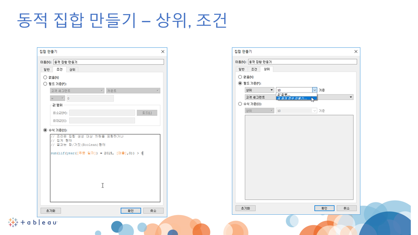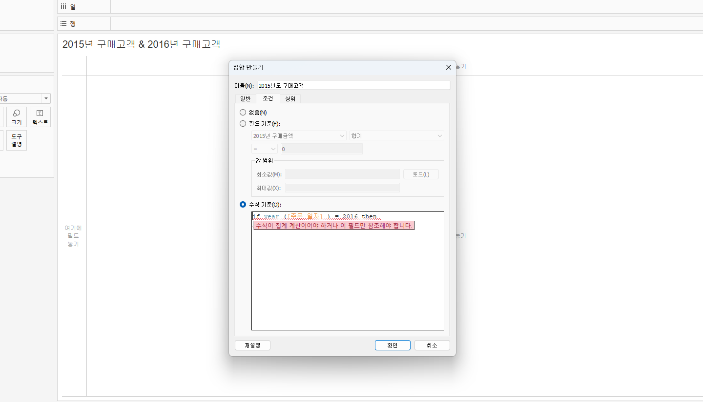 사용자 지정 필드( 사용자 지정필드이기때문에 만들어진 집합은 필터로만 쓸 수 있는 게 아니라, 다양한 시각 투을 사용하여 쓸 수 있다)
