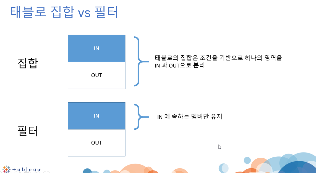 필터는 해당하는 것만 구분하는 거라면, 집합은 조건에 해당하지 않는 것도 분석에 쓸 수 있음.
