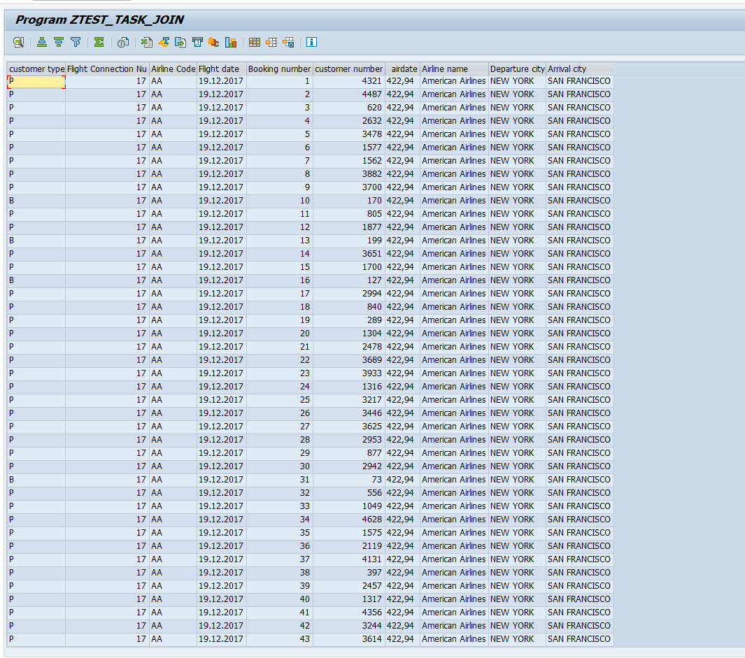 SELECT s~carrid, s~carrname, p~connid, p~cityfrom, p~cityto, f~fldate, f~bookid, f~customid, f~custtype,r~price