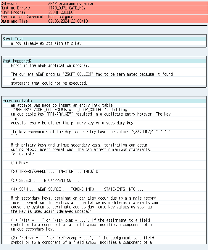 -> ' table 명 TYPE SORTED TABLE OF WITH NON-UNIQUE KEY' 및 'table 명 TYPE SORTED TABLE OF WITH UNIQUE KEY'의 차이점 확인하기