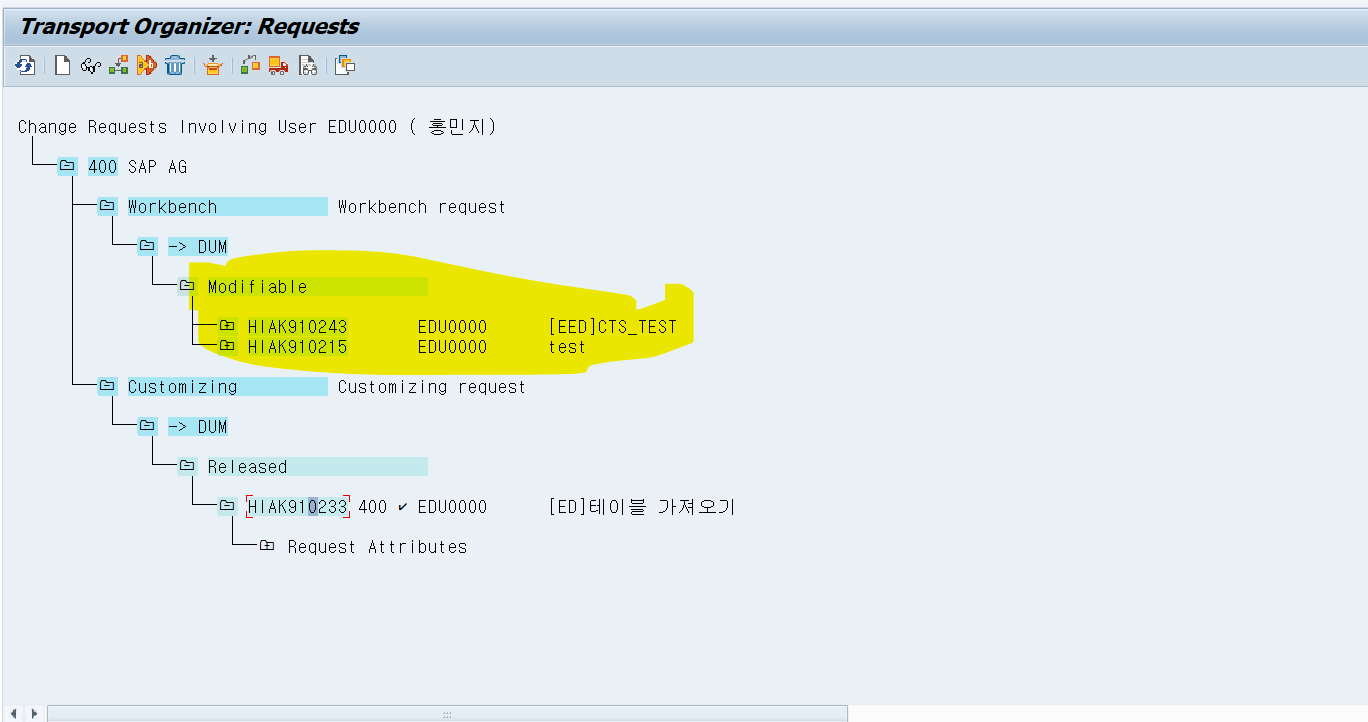 Workbench request : client independent 속성의 오브젝트. abap repository가 대상이다.(테이블, 함수, 프로그램 등)