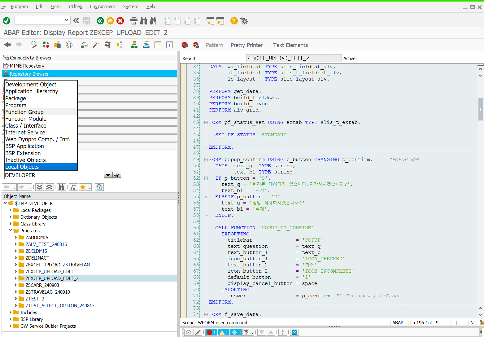 PERFORM popup_confirm USING p_button CHANGING p_confirm. -> 확인 팝업 띄운다