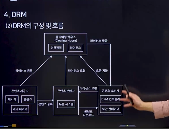 3)    권리 표현 기술(해당 하는 콘텐츠에 대해 어떤 권리 요구 가능?) : 콘텐츠에 대한 규칙을 설정(XrML) / render(이용) Transport(교환) derivative(변환)