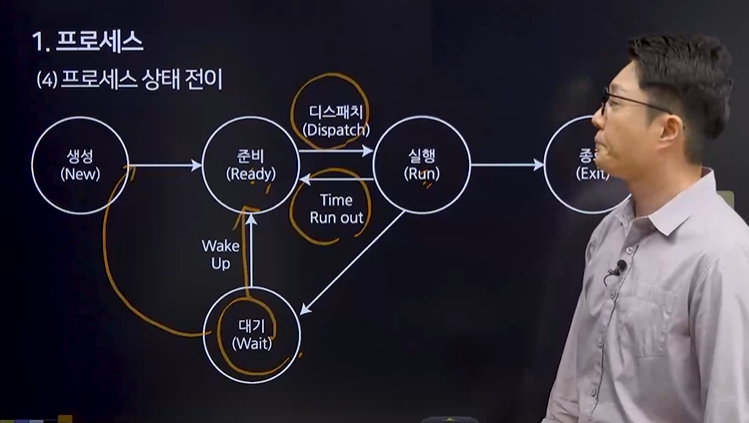 생성(NEW) -> 준비(READY) -> 실행(RUN) -> 종료(EXIT)