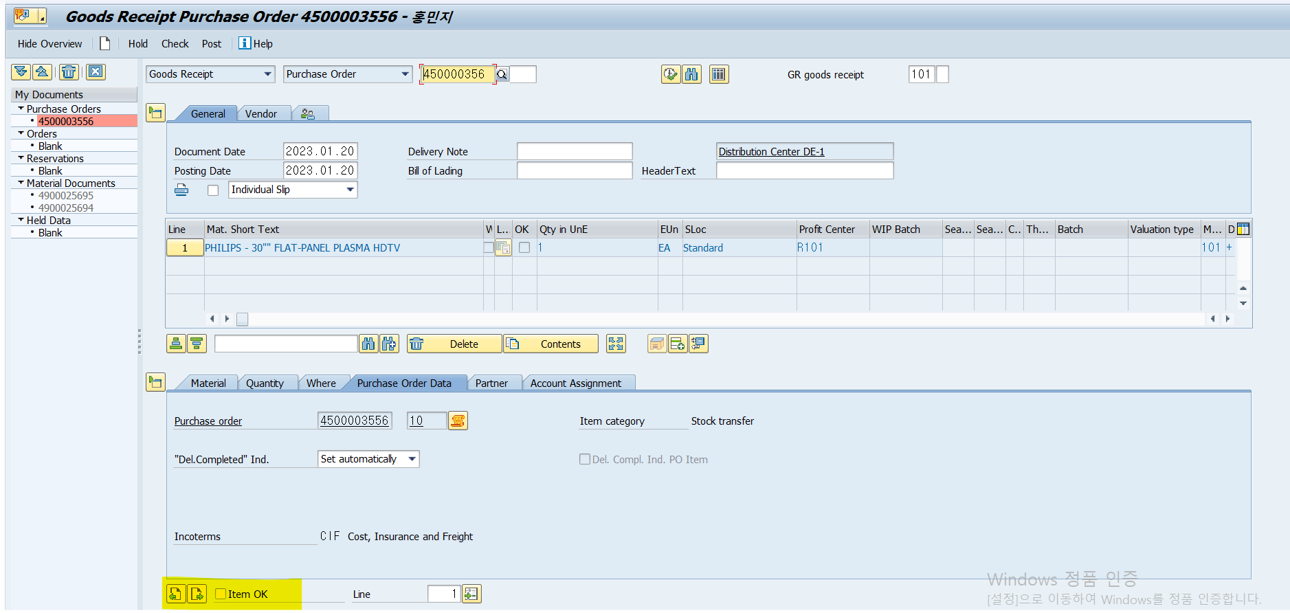 목적: 재고 이동 후 재고 이동(=판매)에 따른 인보이스 잡고, GR잡기