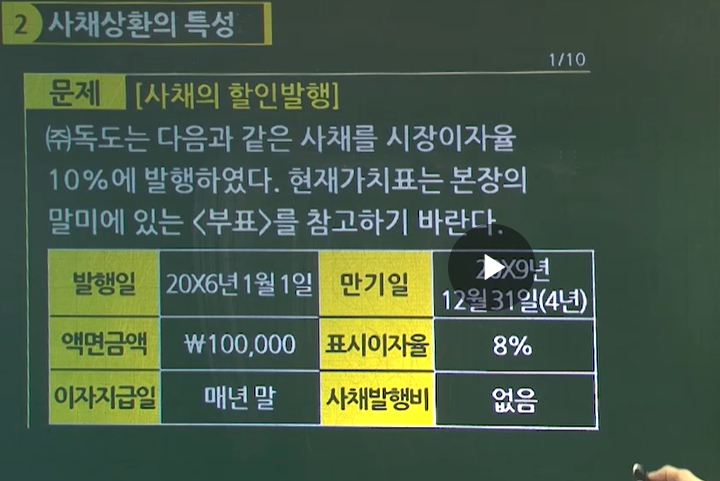 1. 발행 금액 : 10,000 X PV(10%- 시장이자율, 3)