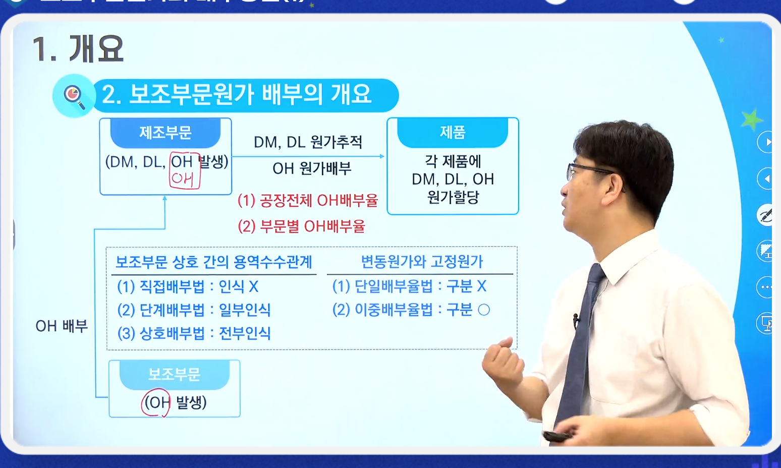 보조부문 : 직접 제품을 생산하지 않고 제조부문을 보조하는 부분 -> OH