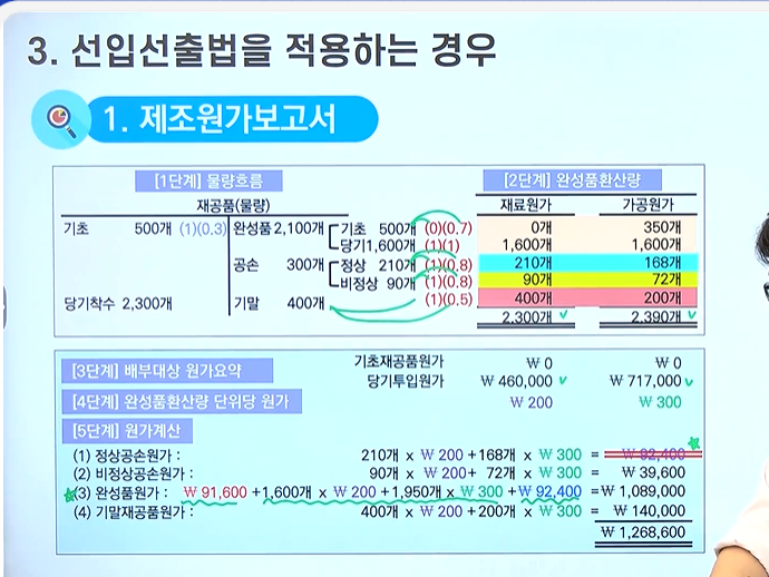 당기 중에 발생한 정상공손원가를 완성품(2,100개)과 기말재공품(400개)에 배부 (배부기준: 물량)