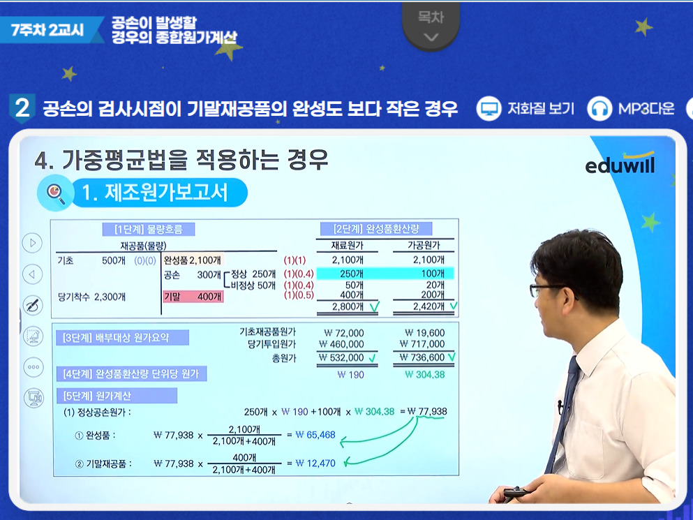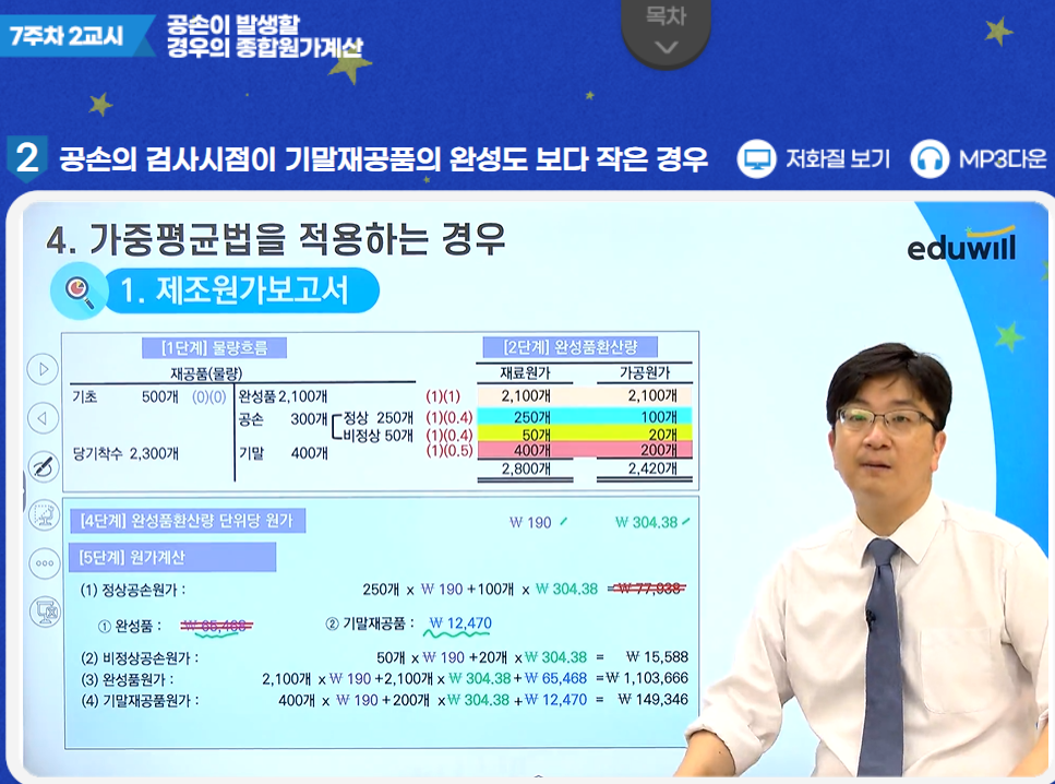 (기말 재공품이 검사를 통과한것, 완성품과 기말재공품이 전부 정상품이다. 따라서 정상공손이 완성품과 기말재공품이 나눠서 반영해야함)