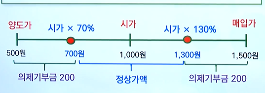 ②예외적으로 특수관계인이 세법상 기부금 대상 단체인 경우에는 기부금으로 봄 - 의제기부금(간주기부금) : 법인이 특수관계인 외의 자에게 정당한 사유 없이 자산을 정상가액(시가에 시가의 30%를 가산하거나 차감한 법위 내의 가액)보다 낮은가액으로 양도하거나 높은 가액으로 매입함으로써 그 차액 중 실질적으로 증여한 것으로 인정되는 금액