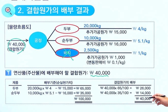 - 우선적으로 부산물의 순실현가치만큼 부산물에 결합원가를 배부함 -> 나머지 결합원가를 연산품(주산물)에 배부함