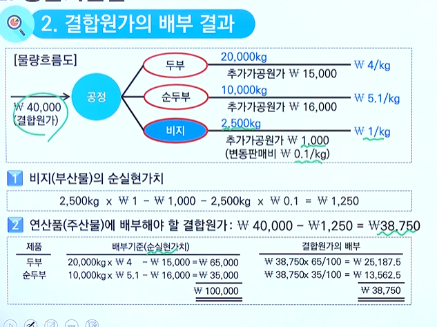 - 우선적으로 부산물의 순실현가치만큼 부산물에 결합원가를 배부함 -> 나머지 결합원가를 연산품(주산물)에 배부함