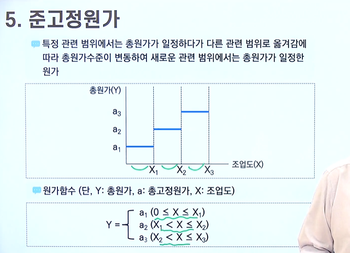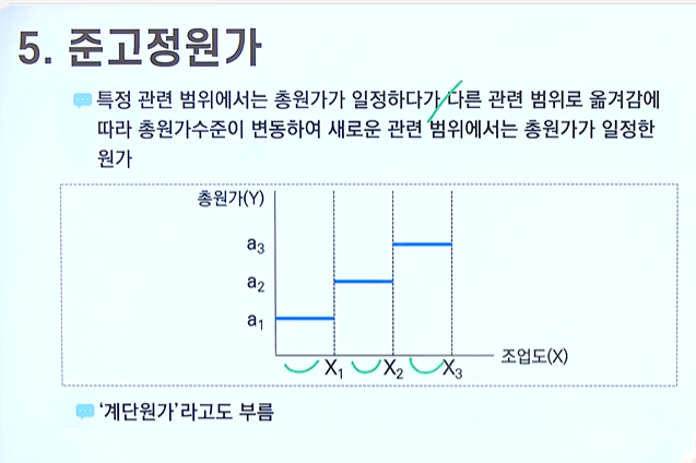 - 특정관련 범위에서는 총원가가 일정하다가 다른 관련 범위로 옮겨감에 따라 총원가수준이 변동하여 새로운 관련 범위에서는 총원가가 일정한 원가
