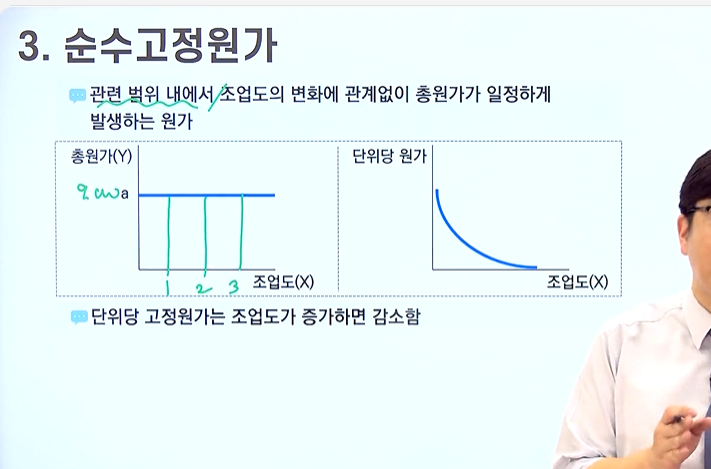 - 관련 범위내에서 조업도의 변화에 관계없이 총 원가가 일정하게 발생하는 원가