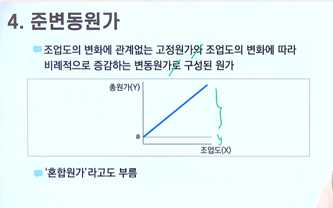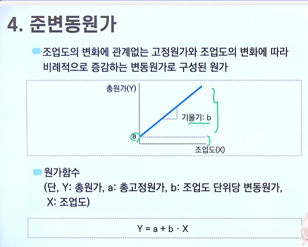 예시) 전기료 -> 전기료의 일부는 기본요금으로 조업도에 관계없이 총원가가 일정하게 발생하지만, 전력사용량(조업도)을 증가시키면 이에 비례하여 전기료가 증가하게 됨