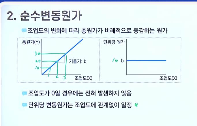 - 조업도의 변화에 따라 총원가가 비례적으로 증감하는 원가