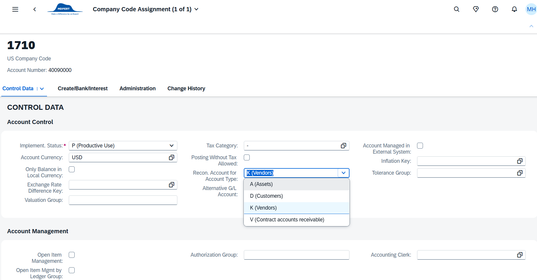 3) Recon. account for acct type : 이 계정코드가 Vendor Master나 Customer Master 혹은 Asset Master의 Reconcilation 계정인지 설정하는 필드. Reconciliation 계정코드는 General Ledger와 Sub Ledger 간의 integration을 하여 만들어진 계정코드 이며, 여기에 Reconciliation 계정으로 설정이 된 경우에는 직접 이 계정으로 전표생성을 할 수 없으며, 반드시 Vendor, Customer, Asset 등의 값으로 전표를 생성하게됨.