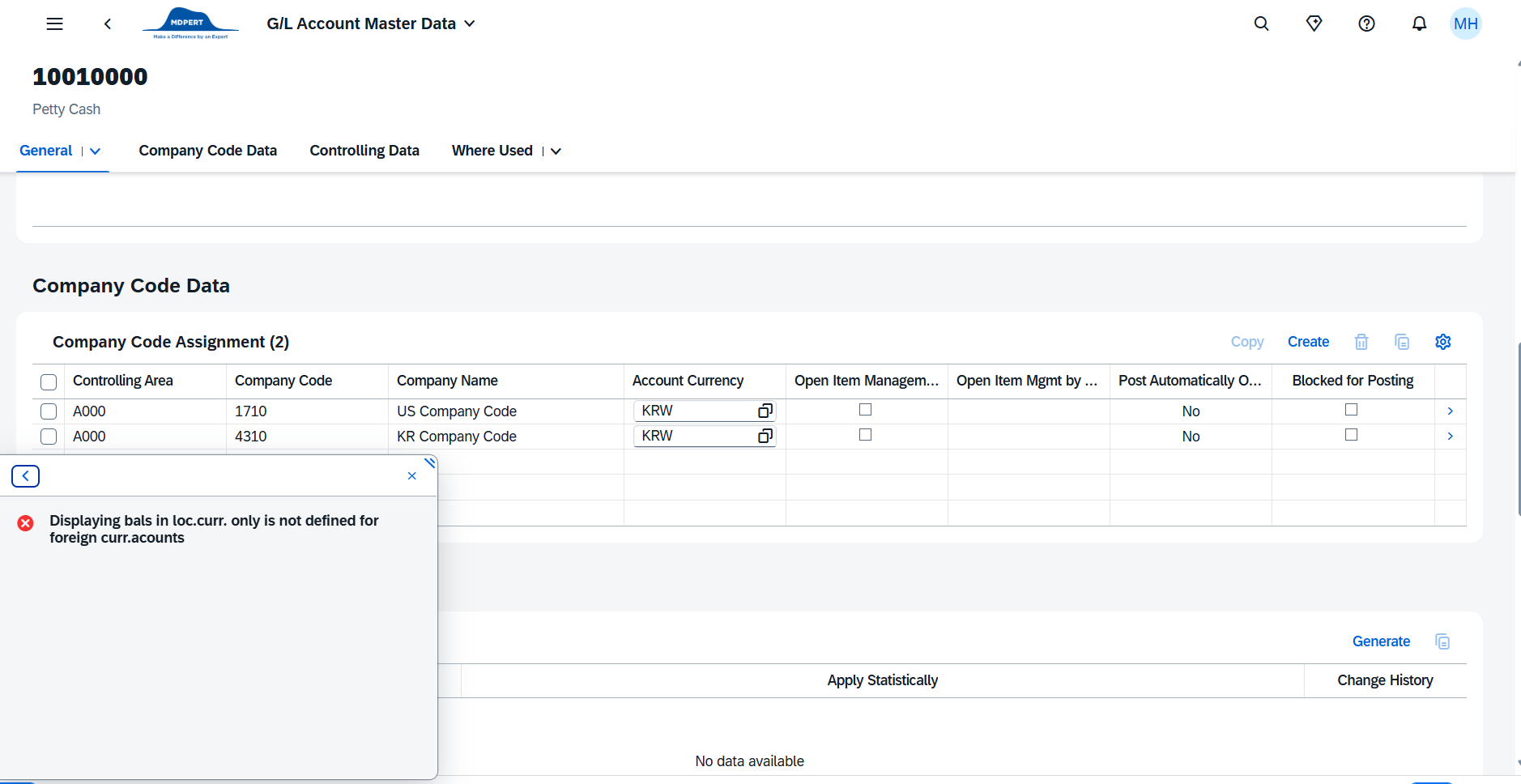 ※ Company code view의 G/L Account Group 상 local currency 수정하는 경로 확인 필요