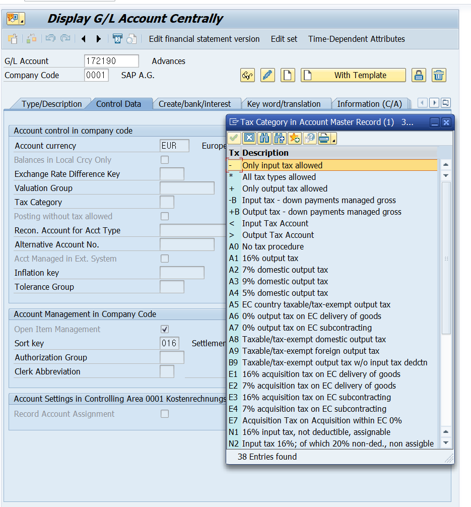 경로 : manage G/L Account Master Data > CoA, G/L Account, Company Code 선택 > Tax Category 수정