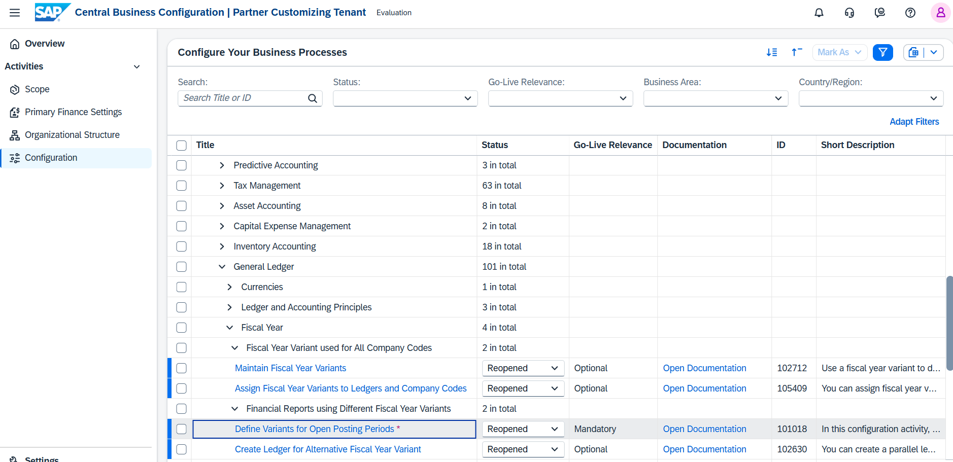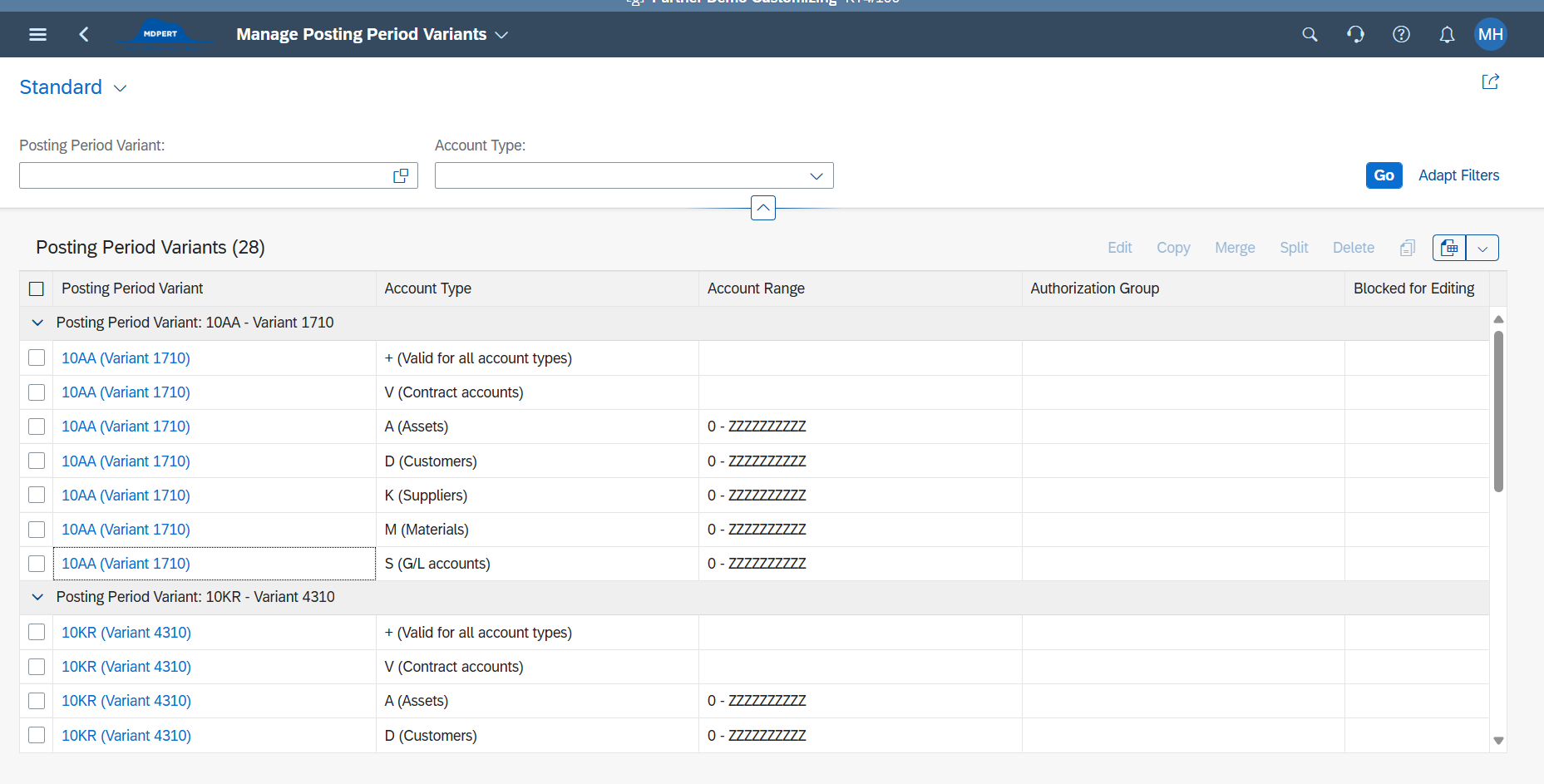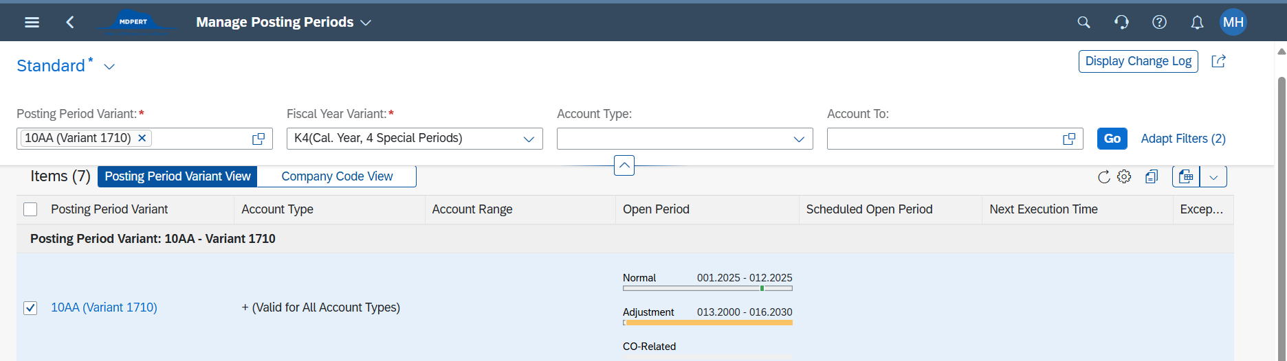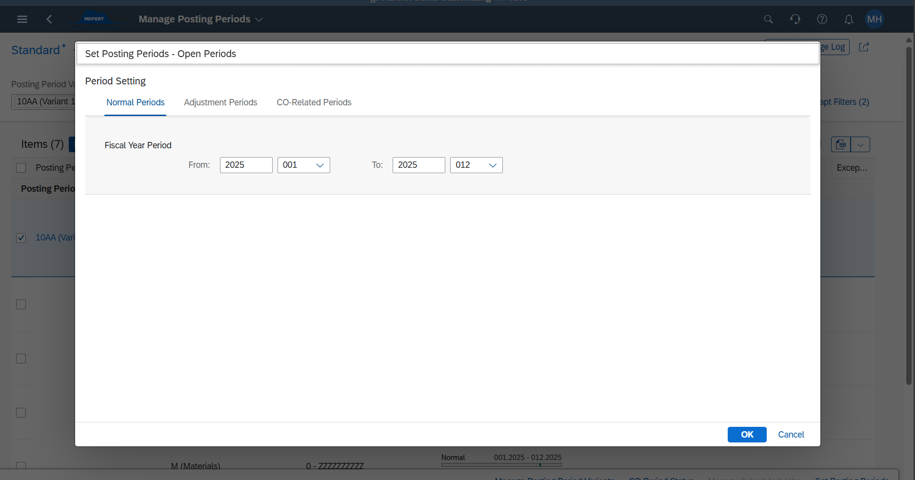 해당 variant 별로 Posting Period를 수동으로 조정함