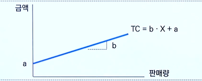 - TC (Total Cost )= a + bX / a = 고정원가 총액 / b = 단위당 원가 / X = 총생산량