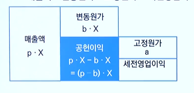- p : 단위당 판매 가격 , X : 판매량, a : 고정원가, b : 단위당 변동원가