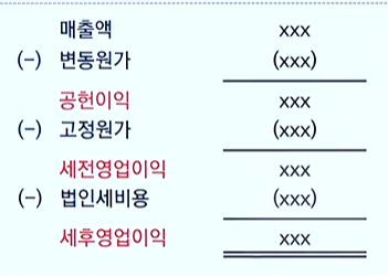 - 매출액 - 변동원가 - 고정원가 = 세전영업이익(법인세 차감전)