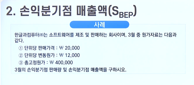 - 안전한계 매출액(Sa-Sbep) = 실제 매출액이 손익분기점 매출액을 초과하는 매출